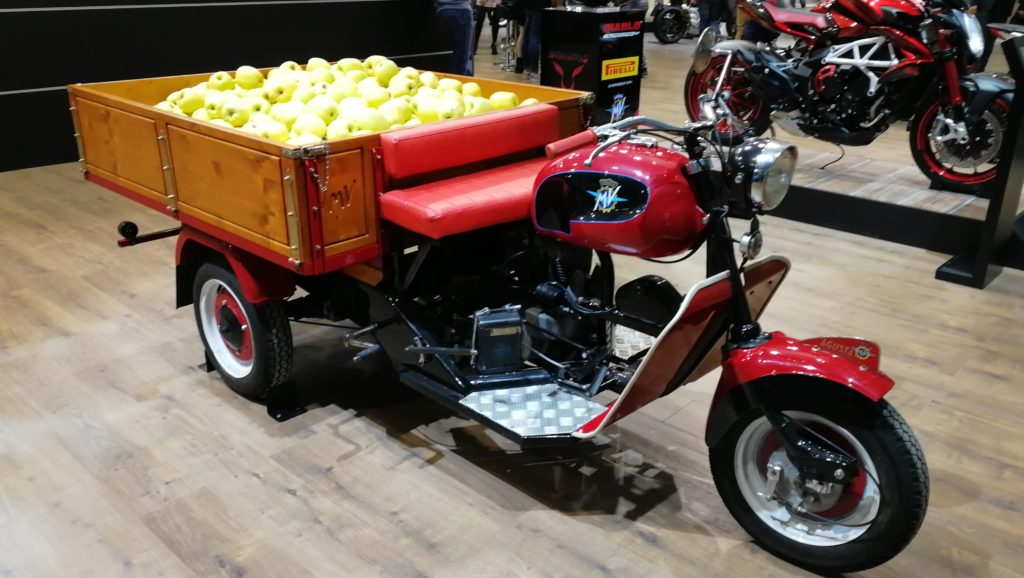 Studiato nei minimi particolari, con una disposizione dei modelli che segue una logica cardinale e polarizzante. Non mancano i richiami al passato, ci sono la GP 500 di Agostini e la leggendaria 750 4C stradale, che coprono le spalle rispettivamente alle nuove F2 da GP e Brutale 1000. C’è pure un motocarro anni cinquanta, uno di quei tanti che hanno permesso ai nostri nonni di ricostruire l’Italia da zero portando mattoni, sabbia e quant’altro a quintali. In questo caso ci sono delle mele.