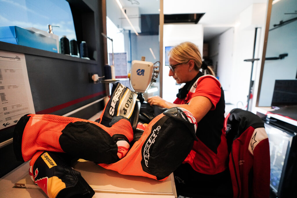 Alpinestars arriva a portare quattro tute per pilota, una in più delle tre minime richieste da Dorna, includendone almeno una non traforata in caso di imprevisti come pioggia o vento freddo. Oltre a questo, ci sono numerosi ricambi, da pezzi di pelle pronti per la cucitura ad assiemi già assemblati come maniche intere. Anche le gobbe sono in inventario, poiché variano a seconda dell’esigenza del pilota. Il tutto è affidato alle abili mani delle sarte, splendide da vedere all’opera, che occupano il piano inferiore del service.