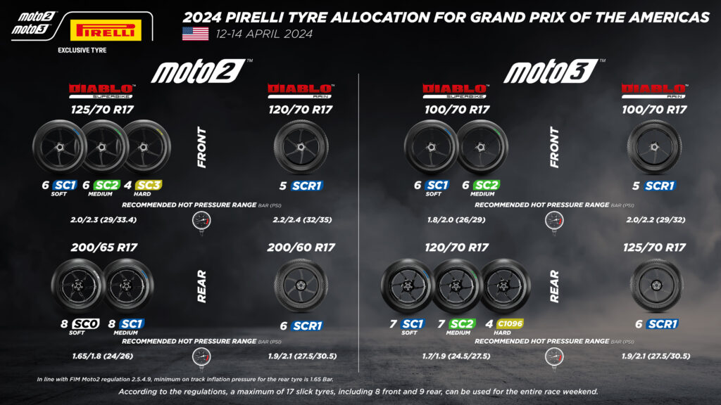 Per il GP delle Americhe i piloti della Moto2 avranno a disposizione 16 pneumatici anteriori slick, di cui n.6 SC1, n.6 SC2 e n.4 SC3, e 16 posteriori slick, di cui n.8 SC0 e n.8 SC1. Questo mentre i piloti della Moto3 avranno a disposizione 12 pneumatici anteriori slick, di cui n.6 SC1 e n.6 SC2, e 18 posteriori slick, di cui n.7 SC1 e n.7 SC2 e n.4 C1096 (definita come Hard).