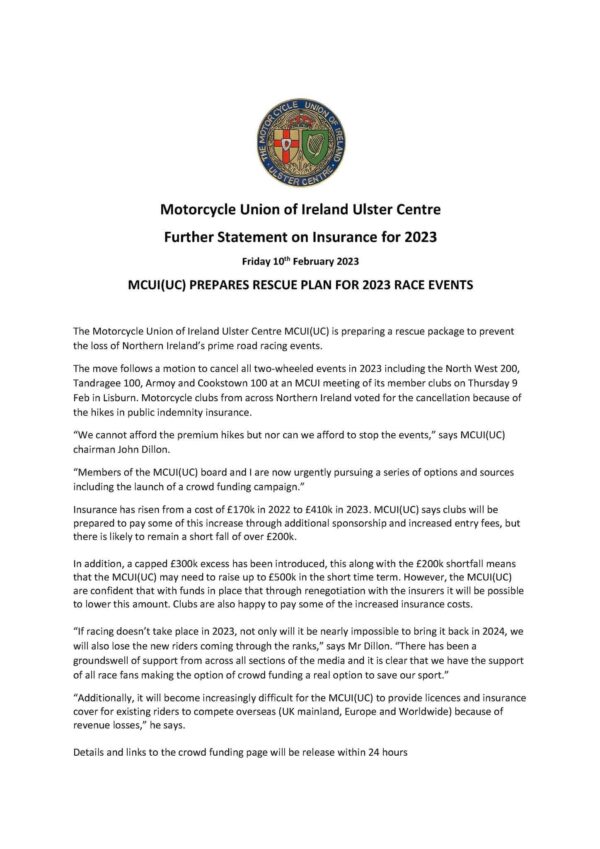 Nonostate il mancato svolgimento della stagione 2023 sarà garantito a tutti i titolari di licenza sportiva il supporto della unione dei club motociclistici, che significa copertura assicurativa e tutela nelle competizioni. Questa assistenza è necessaria per tutti i piloti che volessero prendere parte a qualsiasi tipo di evento competitivo in Irlanda, UK o nel resto del mondo.