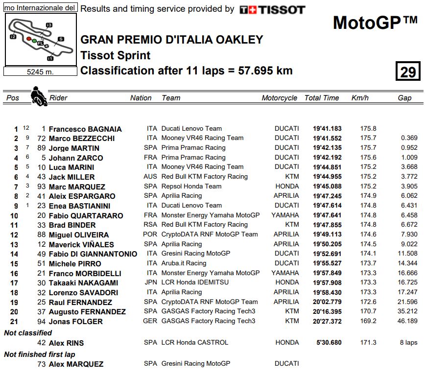 Terminata la Sprint della MotoGP al Mugello, a trionfare è Francesco Bagnaia che completa gli 11 giri di gara in 19’41″183. Il Campione in carica, che scattava dalla pole, è stato imprendibile per chiunque, difendendosi egregiamente prima da Martin, con cui si è pure scambiato brevemente la posizione nei primi giri, e poi resistendo a Bezzecchi che provava a riacciuffarlo. Non sono mancati attimi di tensione, complice delle gocce di pioggia che sono iniziate a cadere sul tracciato toscano durante il warm up lap e i primi giri. Fortunatamente ha smesso subito. Inoltre Bagnaia ha siglato anche il giro più veloce in questa sprint, un 1’46”187 fatto nel corso del settimo giro.