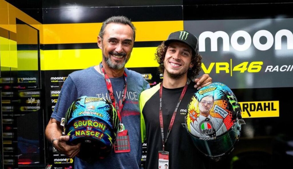 Per il GP di casa, Bezzecchi ha deciso di sfoggiare un casco dedicato al comico Giacobazzi, suo mito sin dall’infanzia. “Il casco viene dalla mia passione per Giacobazzi, sono un suo grande fan da sempre. Guardo i suoi sketch ogni sera coi miei amici” dice il Bez. “Da sempre volevo dedicargli un casco e questa mi è sembrata la volta buona. Ho raggiunto Giacobazzi tramite Ciabatti, a quanto pare sono amici da una vita e ci son rimasto male quando l’ho scoperto. L’ho chiamato ma all’inizio mi vergognavo e non riuscivo nemmeno a parlargli. Sono contento che alla fine il casto gli sia piaciuto. Spero questo casco strappi più di un sorriso, ma vi prometto che domani non ci saranno gare d’ignoranza e se servirà aiuterò Pecco.”