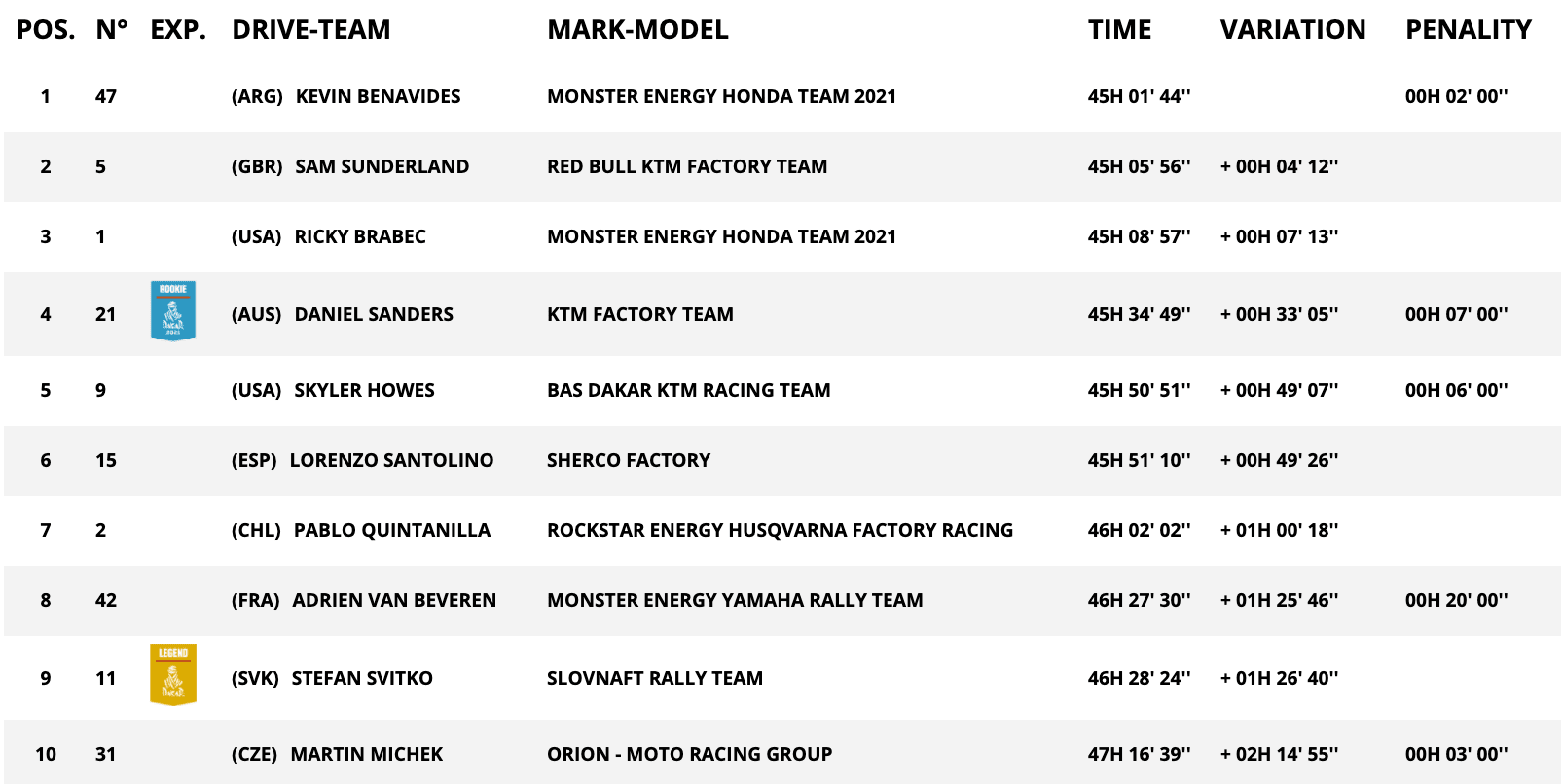 Con Barreda e il suo ritmo indiavolato fuori dai giochi, a vincere la Stage 11 è stato Sam Sunderland. Il britannico di KTM era quasi riuscito nell’impresa di ricucire in un colpo solo i 10′ e poco più che lo separavano dalla prima posizione assoluta di Kevin Benavides, ma una seconda parte di Speciale condotta in maniera molto costante dall’argentino non gli ha permesso di centrare un risultato che avrebbe avuto del clamoroso. Alle spalle di Sunderland si è fatto rivedere Pablo Quintanilla, piuttosto sottotono in questa Dakar, mentre il poco più sopra citato Kevin Benavides ha limitato i danni completando la Stage 11 in 3^ posizione. Alle sue spalle è arrivato il rookie Daniel Sanders, mentre Matthias Walkner ha preceduto Ricky Brabec: lo statunitense ha pagato lo scotto di dover aprire la pista in una Stage decisamente complicata a livello di navigazione, perdendo di conseguenza minuti in classifica e slancio nel suo tentativo di rimonta.