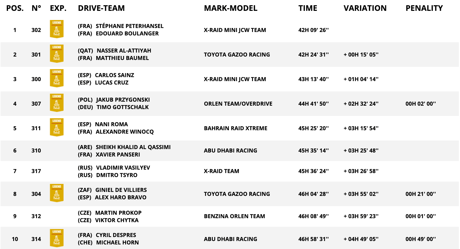 Sul 3° gradino del podio sale ancora una volta Carlos Sainz, che precede l’ancora ottimo Yazeed Al Rajhi – 4° nonostante le difficoltà causate dal suo essere apripista in questa Stage 11 – e Cyril Despres, nuovamente in top five dopo qualche Speciale di troppo conclusa nelle retrovie. Wei Han e Giniel De Villiers occupano rispettivamente la 6^ e 7^ piazza, mentre le prime dieci posizioni di giornata vengono completate dal trio formato da Vladimir Vasilyev, Khalid Al Qassimi e Yasir Seaidan.