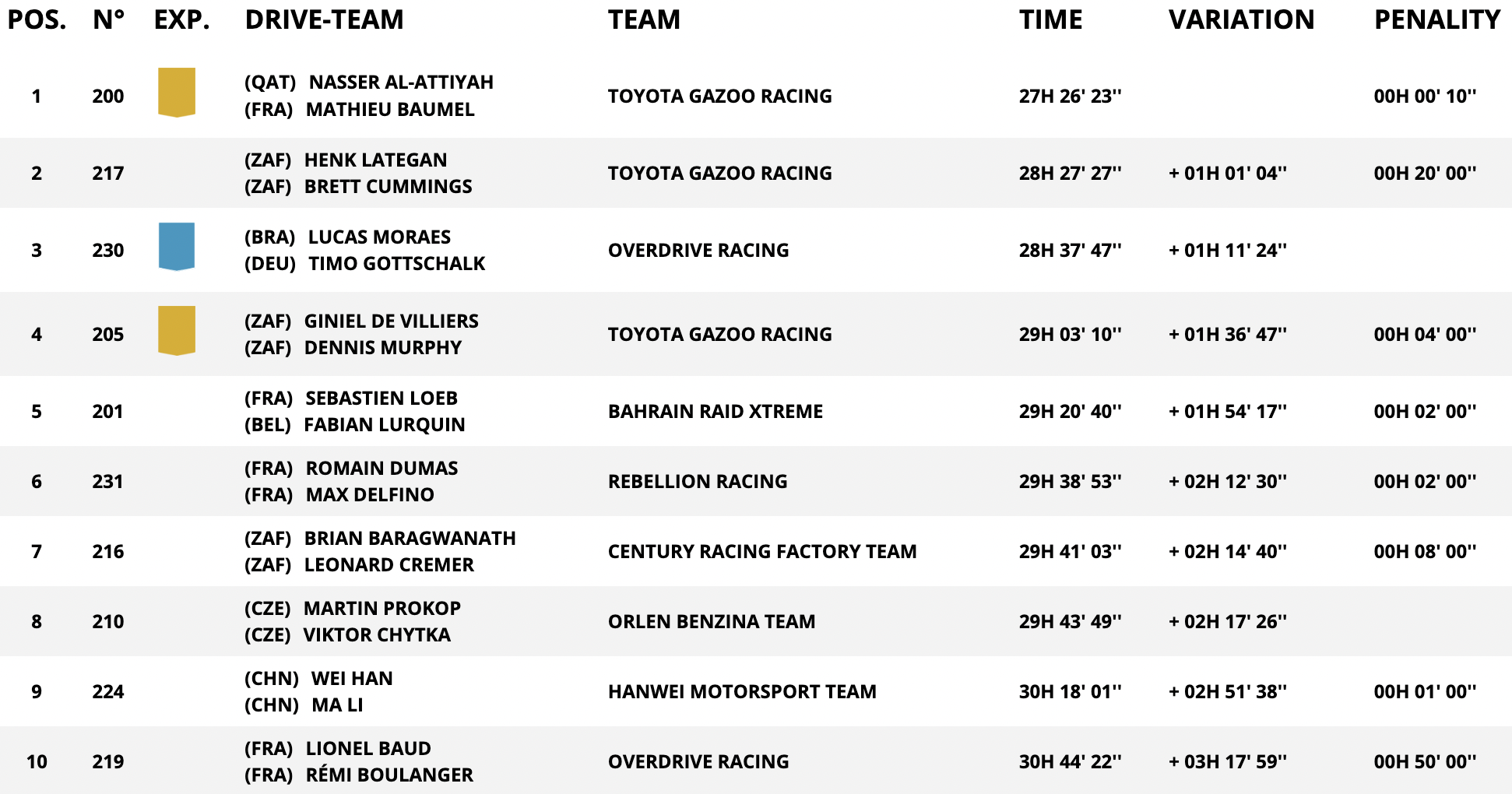 Mentre i suoi avversari più accreditati crollano sotto i colpi di una finora implacabile Dakar 2023, Nasser Al-Attiyah continua a viaggiare apparentemente indisturbato tra dune sabbiose e canyon rocciosi. Il portacolori di Gazoo Racing nella classifica assoluta ha ora un vantaggio di 1h01’04” su Henk Lategan e di 1h11’24” su Lucas Moraes, 3° davanti a Giniel de Villiers. Il deragliamento di Ekström, piombato irrimediabilmente nei bassifondi della classifica, spalanca le porte della top five assoluta a Sebastien Loeb: l’alsaziano è ora 5°, seppure staccato di 1h54’17” dalla vetta.
