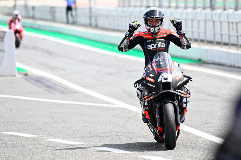 Con la bandiera a scacchi sulla Sprint del GP di Catalogna si completa il sabato (quasi) perfetto di Aleix Espargaro. Agguantata la pole, con tanto di record, stamattina nelle qualifiche, il #41 dell’Aprilia è riuscito a cogliere una vittoria frutto di costanza e pazienza nella gara corta della MotoGP. Gli è mancato solo il giro veloce della Sprint, segnato invece da Raul Fernandez (1’38”991) con la RS-GP23 del team Trackhouse. Condotta eseplare per Aleix, che se l’è presa quasi comoda perdendo quattro posizioni al via. Curate al meglio le Michelin nei primi due giri, Espargaro ha quindi iniziando a spingere e recuperare posizioni condendo il tutto con uno splendido sorpasso su Acosta all’inizio del settimo giro per la seconda posizione.