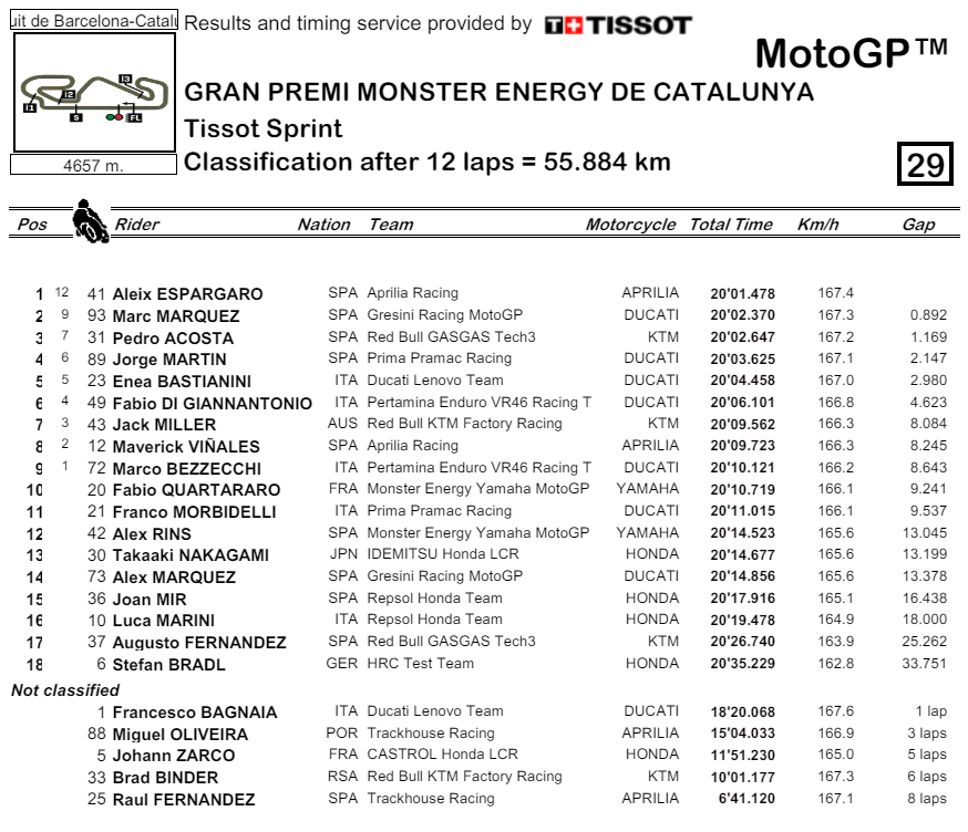 Gara a eliminazione la Sprint della MotoGP in Catalogna, a vincere è Espargaro dopo che Raul Fernandez, Binder e Bagnaia sono caduti uno dopo l’altro mentre erano in testa. Il #1 è caduto nel corso dell’ultimo giro mentre aveva un margine di sicurezza sul #41. Marc Marquez, autore di un’altra splendida rimonta, e Acosta a podio, Martin 4° si accontenta dei punti.