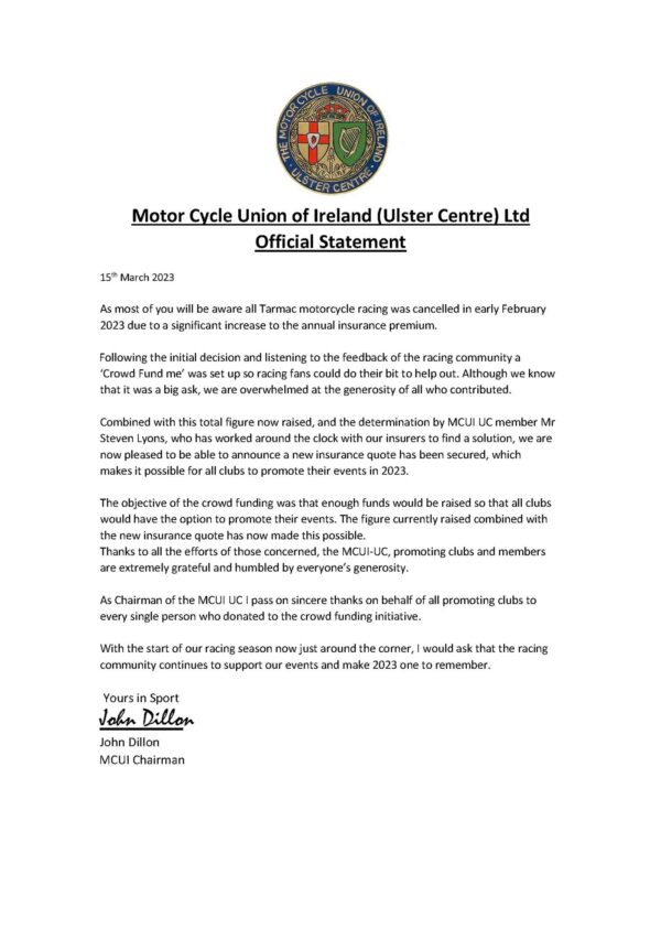 Dopo la batosta di inizio anno, con l’annullamento dell’intera stagione del motorsport (gestito dalla MCUI) a causa del prezzo folle delle assicurazioni, ecco l’insperata notizia: le gare cancellate saranno invece disputate, tutti i club possono preparare gli eventi! Motor Cycle Union of Ireland, anche grazie al supporto dei tantissimi appassionati, annuncia ufficialmente lo svolgimento della stagione 2023 delle road races nordirlandesi.