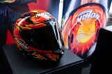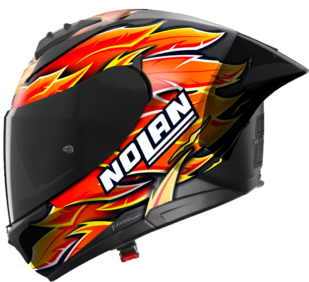 Tra i due caschi le differenze a livello di livrea sono minime, dettate dalle caratteristiche tecniche e dalle differenti componenti applicate sulle calotte. Andando più nello specifico, il modello X-804 RS UC REPLICA IANNONE è molto simile all’originale indossato da Andrea Iannone in gara ed è la versione top di gamma integrale in fibra Speeding di Nolan. Personalizzato con una finitura lucida, si caratterizza esteticamente per le trame di carbonio a vista e dettagli grafici esclusivi. Il mix di rosso, arancio, giallo e bianco cangianti si alternano a parti in fibra di carbonio nero a vista e altre lucide, per un look grintoso. Il rosso avvolge la fenice e si estende su tutta la parte superiore della calotta, proseguendo fino allo spoiler. Proprio lo spoiler posteriore è in tinta, riprende la stessa grafica spingendosi fino all’estremità del casco e ampliando la personalizzazione. Sul retro, sotto lo spoiler, c’è il numero 29 di gara di Iannone e la frase “LIKE A PHOENIX I RISE FROM THE ASHES”. Le prese d’aria lucide completano il tutto.