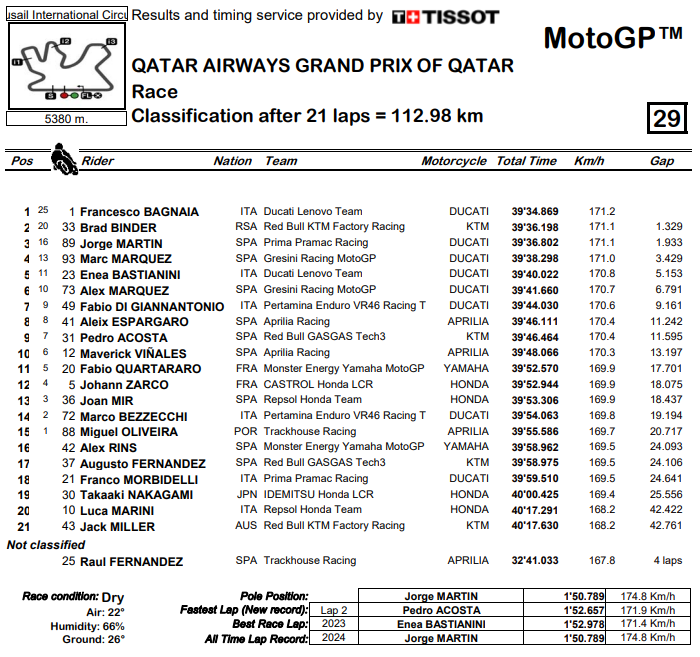 Infine, il Campione di Cervera fresco di passaggio – storico e clamoroso – in Ducati con Gresini Racing, ha parlato anche del suo stato di fiducia in sella alla Desmosedici GP23: “Oggi ho dovuto gestire la gomma anteriore, era quella che mi preoccupava di più. Ieri nella Sprint l’avevo finita, per cui oggi mi sono concentrato su quello. Quando Martin ha allungato dopo la mia lotta con Pedro [Acosta, n.d.r.] ho provato a riprenderlo usando tanto l’anteriore, e quando sono arrivato dietro di lui la temperatura è salita molto. Con queste moto è difficile avvicinarsi, anche Martin sembrava più veloce di Binder, ma quando arrivava dietro non riusciva a sorpassarlo. Bisogna gestire tante cose.”