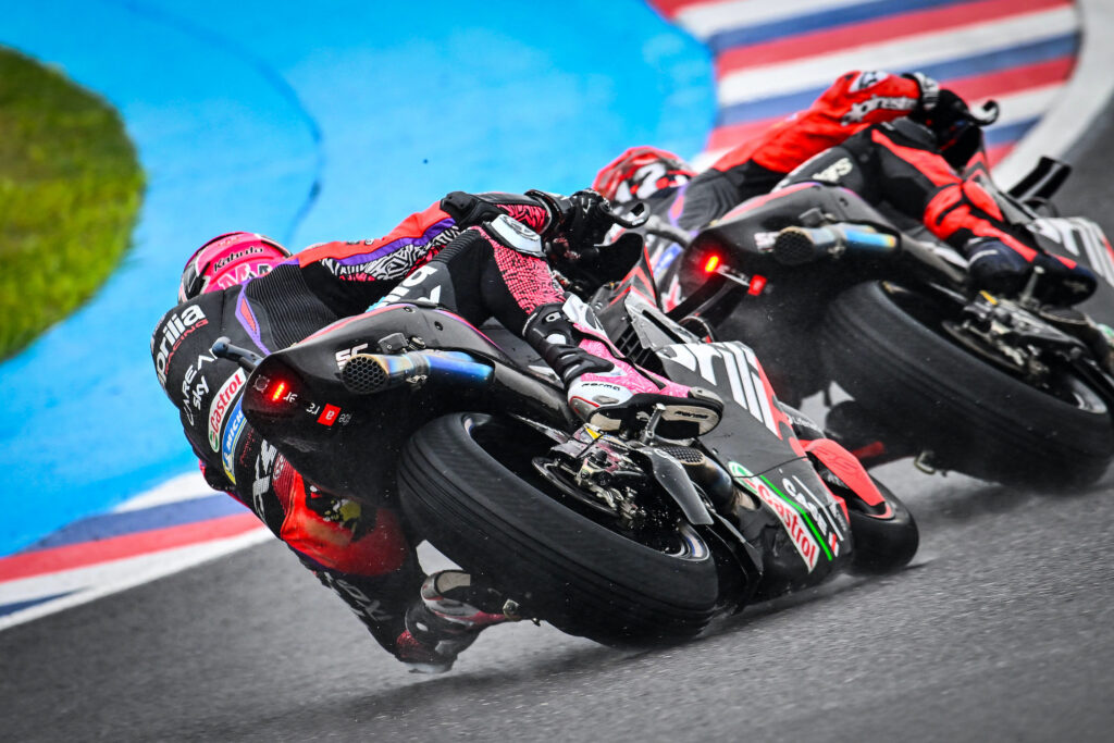 Aprilia pareva destinata al trionfo in Argentina. Le premesse erano buonissime, ci aspettava molto dalla Casa di Noale dopo l’hat trick messo a segno nel 2022 da Espargaro a Termas, e confermate dai risultati del venerdì con la coppia di piloti spagnoli perennemente davanti. Aleix e Vinales erano imprendibili sia sul giro secco che sul passo. Sull’asciutto.
