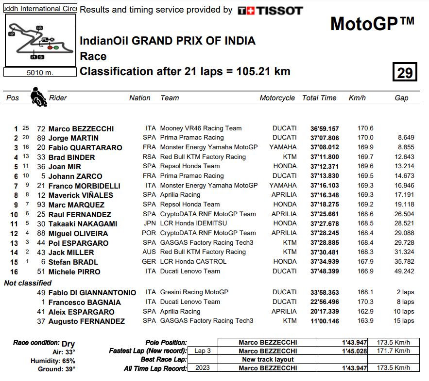 La vittoria di oggi è stata il coronamento di un week end in cui Bezzecchi si è sempre mostrato veloce ed efficace, come dimostrano la Pole e il passo tenuto nella Sprint. Ha chiuso con un margine di oltre 8 secondi sul secondo Martin, e con in saccoccia pure il giro più veloce della corsa, in 1’45”0.23. “Mi sentivo benissimo con la moto, guidavo davvero bene. Non cercavo di vincere in fuga, semplicemente, ho cercato di mettermi davanti per evitare problemi alla pressione delle gomme che mi fa prendere paga ogni volta” dice Marco.
