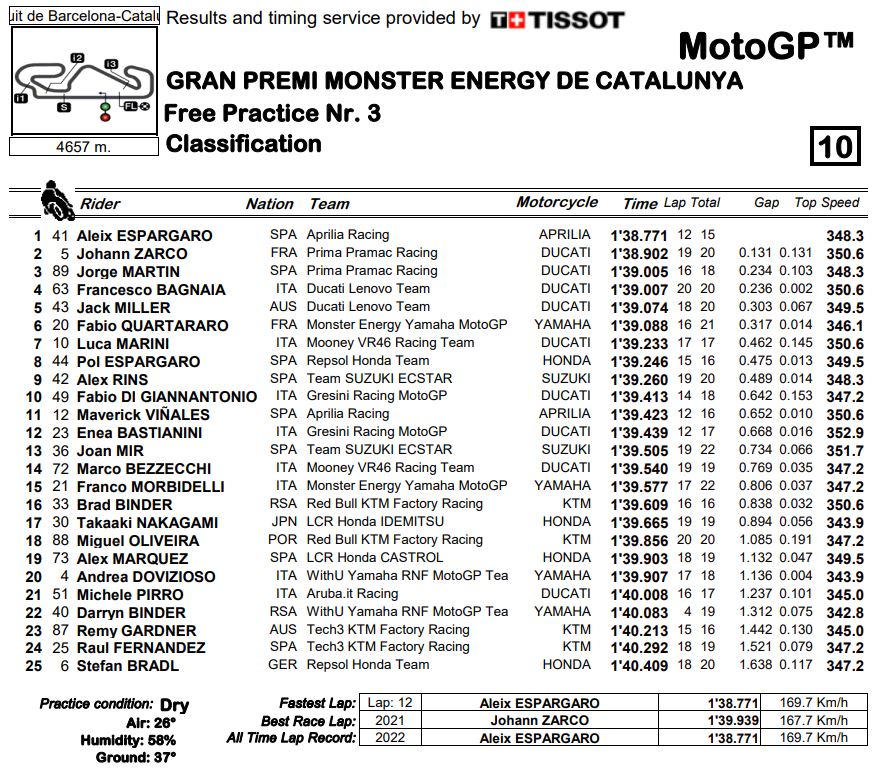 Il pilota di Aprilia Racing chiude davanti a tutti anche le terze libere della MotoGP a Barcellona, piazzando il nuovo record della pista con una facilità disarmante. Meno bene Vinales, che non trova il guizzo nel finale e si ritrova 11°, costretto alla Q1. Bene le Ducati con tutte le GP22 in Top10, e Quartararo.