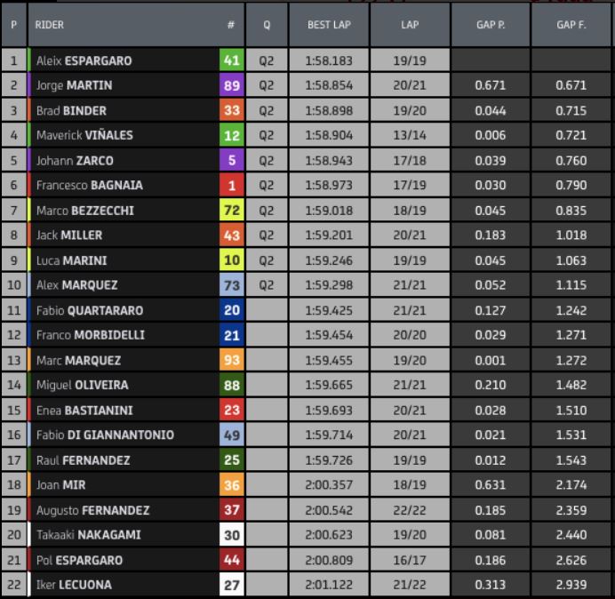 Ottavo tempo per Jack Miller, primo con più di un secondo di ritardo da Aleix, davanti a Marini e Alex Marquez che completano la Top10 accedendo direttamente alla Q2. Il primo dei bocciati è Fabio Quartararo che chiude le prove in undicesima posizione, a 1″2 da Aleix e 127 millesimi dalla promozione diretta in Q2, appena davanti al compagno Morbidelli con l’unica altra M1 in pista. 13° tempo per Marc Marquez, evanescente ma pur sempre miglior pilota della Honda.