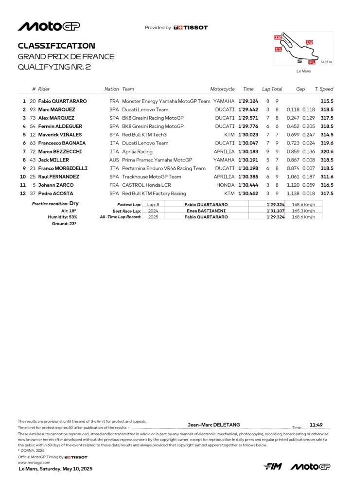 La griglia di partenza per la Sprint e per la gara di domenica vedrà dunque la prima fila aperta da Quartararo assieme ai due fratelli Marquez, mentre la seconda fila sarà occupata da Fermin Aldeguer, Maverick Viñales e Francesco Bagnaia: il ducatista è stato protagonista di una Q2 anonima, condizionata dall’assenza di feeling con la mescola morbida della gomma anteriore. Bezzecchi, Miller e Morbidelli scatteranno dalla terza fila, mentre Raul Fernandez, Zarco ed Acosta chiudono la classifica della seconda sessione di qualifiche del Gran Premio di Francia.