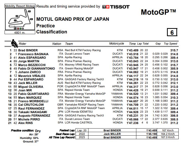 Secondo tempo per Francesco Bagnaia, a 29 millesimi dal sudafricano, e terzo per Aleix Espargaro, davvero in palla seppur a quasi 3 decimi dal #33: entrambi hanno girato sotto il record precedente. Quarto tempo per Martin, davanti a Bezzecchi e al sorprendente Di Giannantonio, che chiude a meno di mezzo secondo da Binder, per una Top6 che vede presenti un’Aprilia, una KTM e quattro Ducati. Seguono Zarco (Ducati), Vinales (Aprilia), Pol Espargaro (GASGAS-KTM) e Jack Miller (KTM) che completano la Top10 e si prendono così i primi dieci posti validi per la promozione diretta in Q2.