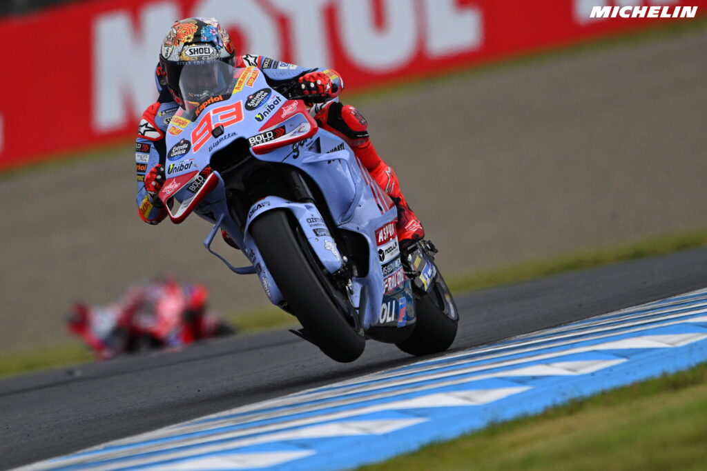 Una gara lunga che ha portato ancora una volta Marc Marquez a dare il meglio di sé per recuperare posizioni dalla parte centrale della griglia di partenza del Giappone. E che, come nella giornata di sabato, si è conclusa con un duello corpo a corpo con Enea Bastianini, ma non con lo stesso identico esito: oggi, l’otto volte campione del mondo è al terzo posto, mentre il #23 Ducati Lenovo appena giù dal podio. “Con Bastianini? Una gestione al massimo, all in, perché avevo paura dell’ultima parte di gara dove lui va molto forte. Continuavo a pensare: ‘Ora questo arriva, questo arriva e mi prende il podio‘. Ero lì, concentrato al 100%, a non sbagliare. Abbiamo fatto una gara buona, non perfetta: nei primi due o tre giri, penso che io non abbia difeso bene quando ho passato Binder. Ho perso tanto tempo. Quando ero terzo, ho cercato di accelerare per prendere i primi due, ma non avevo quel qualcosa in più, soprattutto con questa gomma media dietro che non mi sentivo del tutto bene. Con la soft mi sentivo meglio, ma non avrei finito la gara.“