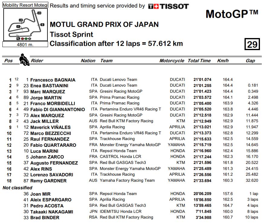 Seconda posizione per Enea Bastianini, che nel finale riesce a resistere a Marc Marquez, terzo nonostante la partenza dalla terza fila, grazie a un bel controsorpasso nella frenata di curva 11. Quarta posizione per Jorge Martin, che partiva dall’11^ casella dopo che una caduta in Q2 gli è costata la prima fila, a 2″ e mezzo da Bagnaia, davanti al compagno Morbidelli. Il leader iridato è riuscito subito a recuperare 5 posizioni nelle prime tre curve, ma non ha avuto abbastanza ritmo per riprendere quelli davanti, approfittando della caduta di Acosta e del ritiro di Binder per recuperare altre due posizioni. Ritiro di Binder avvenuto nel corso del terzo giro, a causa di un problema all’elettronica che ha anche portato a danni al motore. Di Giannantonio, A. Marquez, Miller e Vinales completano la zona punti della Sprint del GP del Giappone. Gara decisamente negativa per Vinales, che partiva terzo ma nelle prime curve ha perso subito otto posizioni lasciando ogni speranza di podio.