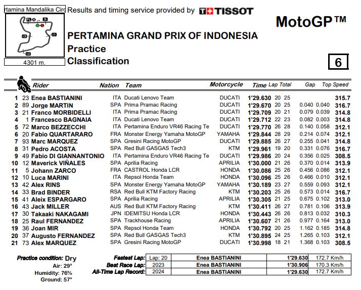 Oggi Enea Bastianini si è masso davanti a tutti nelle Prove ufficiali MotoGP del Gran Premio d’Indonesia, a Mandalika. Il #23 ha stabilito il nuovo record della pista, con un buon 1’29”630 che lima di 3 decimi il primato precedente. Il romagnolo ha si è dimostrato in ottima condizione e sicuramente punta a replicare la vittoria di settimana scorsa a Misano. Jorge Martin ha ottenuto il secondo miglior tempo, per soli 40 millesimi, seguito dal compagno Franco Morbidelli che completa la prima fila dimostrando di aver finalmente ritrovato competitività.