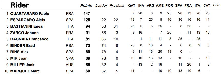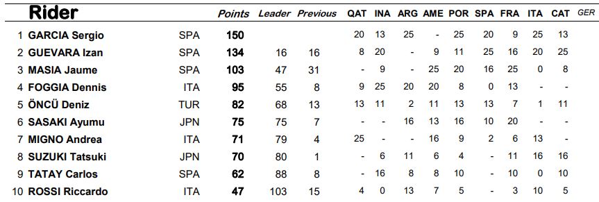 AL momento a comandare le classifiche iridate sono Garcia in Moto 3 (+16 punti), Vietti in Moto 2 (+16 punti), e Quartararo in MotoGP (+22 punti).