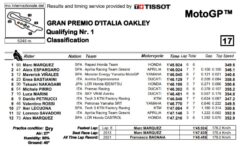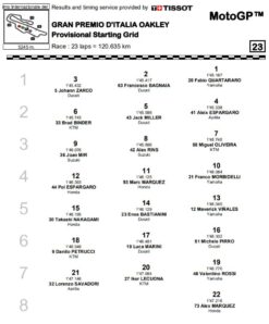 Sarà tutta tricolore la sesta fila, con i Ducastisti Pirro e Marini assieme a Danilo Petrucci, ultimo vincitore del GP d’Italia e ormai un habitué delle ultime posizioni dopo il passaggio in KTM. Solo nono tempo per Valentino Rossi in Q1, che scatterà diciannovesimo in compagnia di Lecuona e Savadori. Ultimo e solitario Alex Marquez.