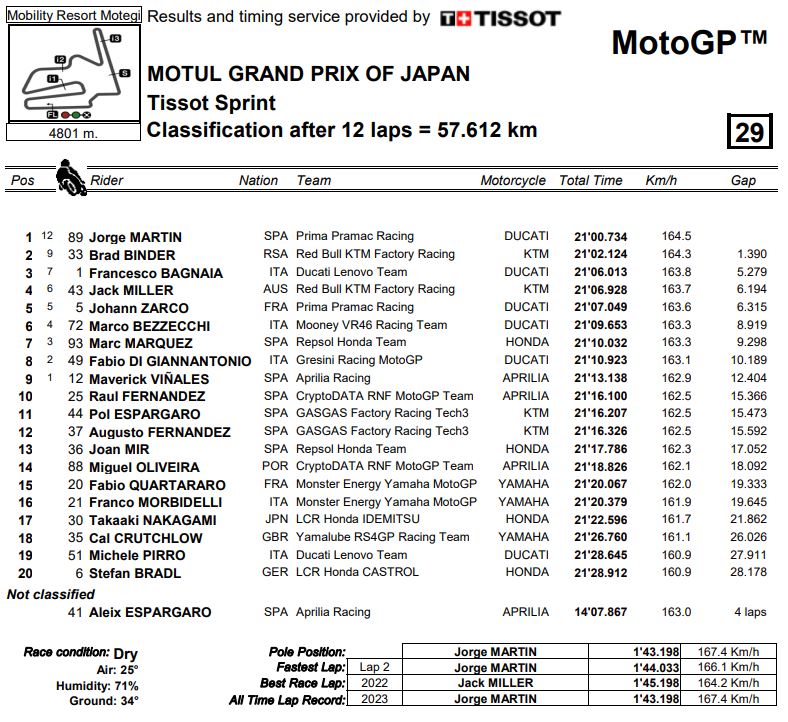 Anche in una pista Stop’n Go come quella di Motegi continua la striscia vincente di Jorge Martin, che dalla pausa estiva è diventato uno schiacciasassi. Nella Sprint del GP del Giappone lo spagnolo del team Pramac è partito nuovamente a razzo, ha capitalizzato al meglio la pole position e conquistato la Sprint al termine di una fuga solitaria martellando per i primi 7 giri lanciati sul passo dell’1’44”basso. Suo anche il girio più veloce, il secondo chiuso in 1’44”033.
