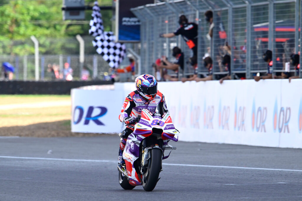 Jorge Martin ha ripreso la sua marcia solitaria verso il titolo iridato: dopo l’infruttuoso GP australiano, dove ha perso punti per una scelta gi gomma posteriore errata, inizia alla grande il GP di Thailandia. Conquistata la pole con il nuovo record assoluto della pista, il #89 ha vinto la gara Sprint ed è la settima affermazione del sabato per lui. Jorge non è scattato perfettamente, con l’anteriore che saltellava troppo, ma è riuscito a resistere all’attacco di Marini alla prima curva e poi ha preso il largo con quattro giri a tuono, tra cui il giro più veloce della Sprint in 1’30”178. Da lì in poi ha iniziato a gestire, pur arrivando a oltre un secondo e mezzo di margine sugli inseguitori, e infine ha tirato i remi in barca per gli ultimi due giri mettendosi 12 punti pieni in saccoccia.
