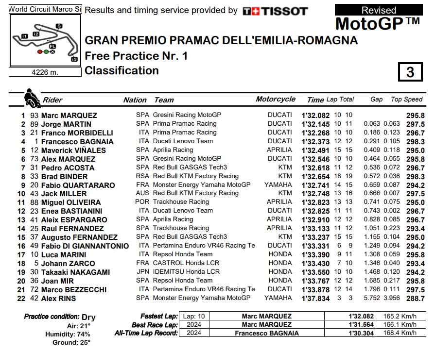 La sessione è invece entrata nel vivo a 15 minuti dal termine, con i piloti che giro dopo giro hanno lavorato per abbassare progressivamente i tempi, fino a far registrare un 1.32.082 che è valso a Marc Marquez il primato della mattinata. Al 2° posto ha chiuso invece il leader del mondiale Jorge Martin, staccato di 63 millesimi e in cerca di riscatto dopo il doppio cambio moto di due settimane fa, che è costato parecchi punti al pilota del team Pramac. Alle sue spalle un positivo Franco Morbidelli, che ha fatto segnare un 1.32.268, tempo con cui si è messo alle spalle il campione del mondo in carica Pecco Bagnaia, che chiude così le FP1 al quarto posto.