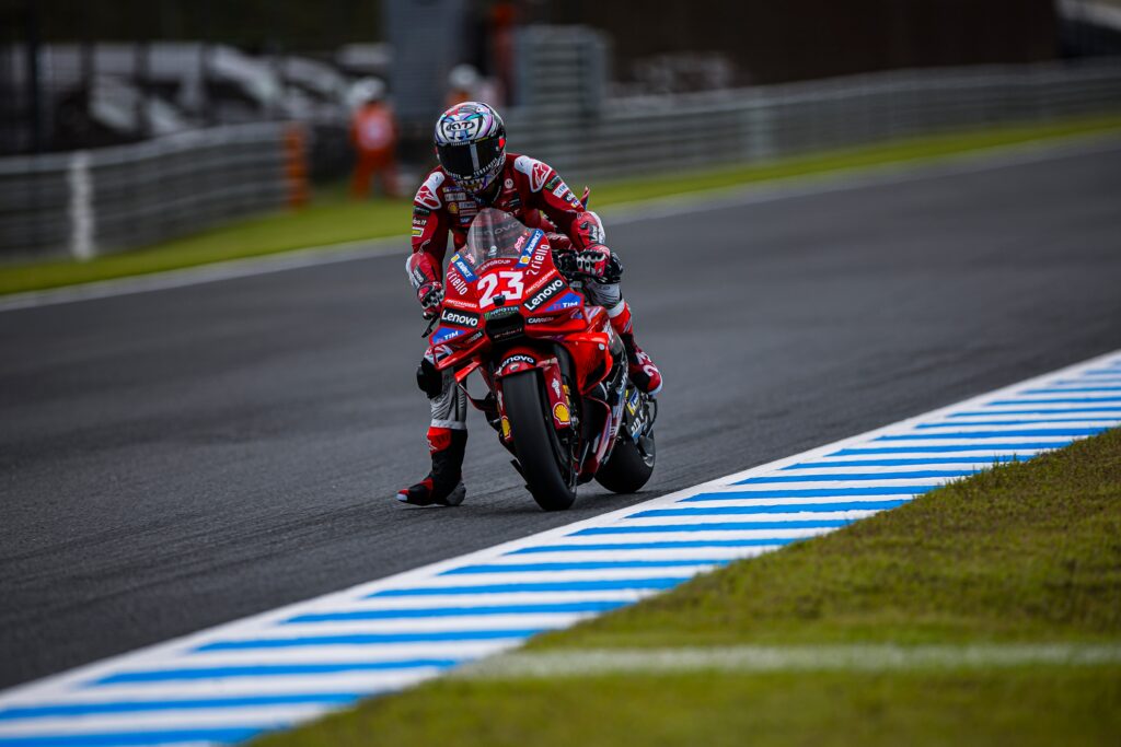 Una medaglia d’argento guadagnata tra sorpassi e controsorpassi quella che si porta a casa Enea Bastianini, secondo alla bandiera a scacchi della Sprint di Motegi. Il #23 completa la doppietta di Ducati ufficiali, con Pecco Bagnaia vincitore al termine dei dodici giri sul circuito giapponese, e il podio interamente occupato dai prototipi di Borgo Panigale, con Marc Marquez terzo. Proprio con l’otto volte campione del mondo Enea ha ingaggiato uno spettacolare duello nel corso del penultimo giro: come di consueto, Marc ha sfruttato le condizioni di pioggia leggera per portarsi a ridosso di Bastianini, compiendo la manovra di sorpasso in uscita di curva nove, salvo poi subire l’infilata di “Bestia” in fondo al lungo rettilineo opposto: Alla nove sono arrivato un po’ lungo e non sono riuscito ad accelerare bene, ho tirato su la moto presto per resistere all’entrata di Marc ma non ho potuto rispondere in entrata alla dieci; curva nove è strana, ha un banking particolare che accentua l’intervento dell’elettronica in uscita: il taglio di potenza mi ha messo in svantaggio in quel tratto di pista, ma sono riuscito a restituire il sorpasso a Marquez in staccata di curva undici”.