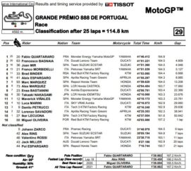 Chi lascia Portimao a pieni voti è Michelin, capace di garantire pneumatici non solo prestanti ma anche consistenti per tutta la gara. A dimostrarlo sono stati i passi gara di Quartararo e Rins, il francese ha imposto un ritmo impressionante che lo spagnolo ha provato a tenere fino alla caduta e il loro duello ravvicinato a suon di giri veloci ha riportato alla mente i bei tempi delle MotoGP 1000 con gomme Bridgestone. Quartararo, che ha dovuto tirare fin dall’inizio per recuperare un pessima partenza dalla Pole, ha vinto completando i 25 giri di gara in 41’46”412. Una rimonta più difficile è toccata a Bagnaia, partito male dalla quarta fila ma secondo sul traguardo con un distacco di 5″, tirando la scia a Mir e Morbidelli, dando vita a tutti i ‘se’ del caso visto il tempone cancellato in qualifica. L’azione e la velocità hanno così caratterizzato e riempito il Gran Premio MotoGP del Portogallo, sostituendo caos e finte incertezze del doppio appuntamento di Losail.
