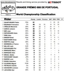 Parte dalla Pole, un regalo di Bagnaia, ma lo fa male, lasciando etti di gomma sull’asfalto portoghese e questo lo fa scivolare fino alla sesta posizione al termine del primo giro. Il brutto inizio non lo ha condizionato, era il più veloce e lo ha dimostrato a suon di sorpassi prima, gli sono bastati otto giri per riportarsi stabilmente davanti a tutti, e di giri veloci poi. Ben nove tornate consecutive in 1’39’’ per il Diablo, di cui un 1’39’’472 quale il miglior giro personale che non è stato, però, il giro più veloce della corsa. Quartararo lascia il Portogallo in qualità di nuovo leader della Classifica iridata, con 61 punti in tre gare, e la volontà di vincere anche il prossimo GP di Spagna a Jerez, dove iniziò il 2020 a razzo.