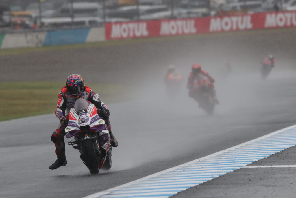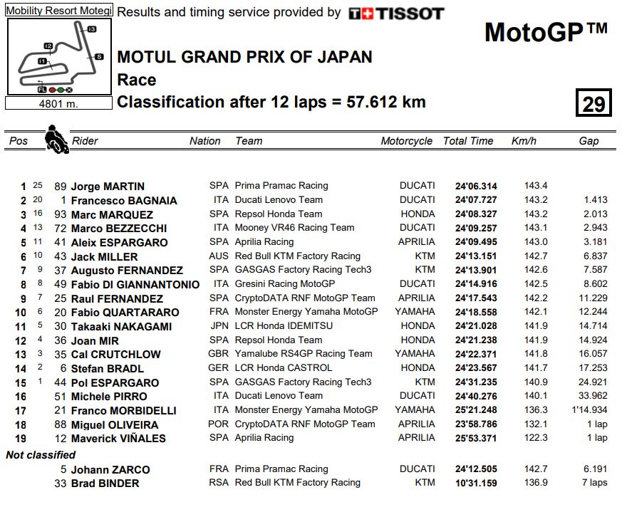 La direzione ha provato a far ripartire la corsa ma senza successo, così il vincitore del GP del Giappone è Jorge Martin, al quarto successo in carriera da quando corre in MotoGP, è stato comunque autore di una gara splendida così come ieri nella Sprint. Scattato dalla pole e mantenuta la leadership anche dopo il cambio moto, lo spagnolo del team Pramac ha rischiato di buttare tutto alle ortiche all’inizio del terzo giro con un lungo che gli ha fatto perdere cinque posizioni. Ma testa bassa e polso slogato se le è riprese tutte ed è tornato davanti a tutti in appena tre giri.
