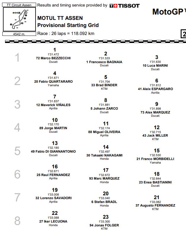 Terminate anche le qualifiche del GP d’Olanda della MotoGP. Ad Assen il più veloce è Marco Bezzecchi, che dopo la splendida giornata di ieri resta il punto di riferimento per tutti. Il pilota del team Mooney VR46 si è preso la pole con decisione, firmando uno splendido 1’31”472 che è il nuovo record della pista, tenendo a bada l’iridato Bagnaia che si deve accontentare della seconda posizione in griglia. Il #1 ha chiuso a 61 millesimi dal compagno di marca. Prima fila anche per Luca Marini, che nonostante una caduta nel finale mantiene la terza posizione in classifica al termine della Q2, a un decimo e mezzo dal compagno di squadra. In Ducati possono così sorridere, per una prima fila tutta desmodromica.