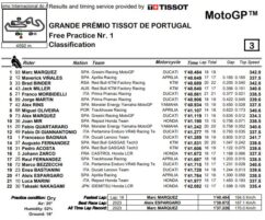 Terminato il venerdì di prove della MotoGP in Portogallo, condizionato da una pista sporca e scivolosa. Bastianini davanti a tutti. Terzo M. Marquez, ‘bene’ Yamaha con entrambi i piloti in Top10.