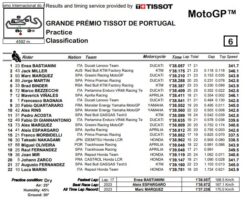 Secondo tempo per Jack Miler, stacato di un decimo, che nonostante una caduta non ha perso il buon feeling che ha in Portogallo con la sua KTM RC16. Alle spalle dell’australiano si è piazzato un Marc Marquez in grande spolvero, che non si è fatto mancare una caduta in curva 5 a due minuti dal termine delle prove ufficiali, nel corso del proprio ultimo time attack. Nel giro della caduta il #93 non si stava migliorando, probabilmente alle prese con un giro di cool down. Quarto tempo per Martin davanti a Binder e Bezzecchi, con quest’ultimo che solo negli ultimi istanti della sessione è riuscito a trovare spazio in Top10 evitando la Q1.
