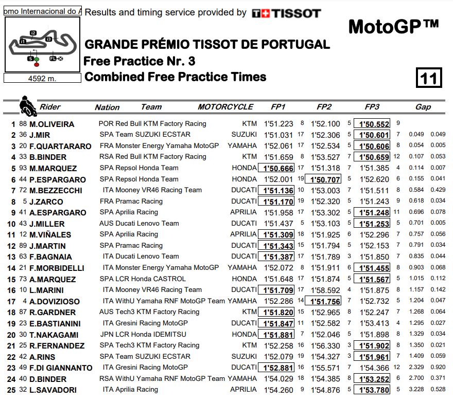 Le condizioni non hanno comunque concesso l’utilizzo di gomme da asciutto nel finale e, per l’accesso diretto alla Q2, i piloti se la sono dovuta giocare con le Rain e solo nei primi minuti, dato che a mezz’ora del termine la pioggia è tornata a cadere. Alla fine il più veloce è stato il padrone di casa Oliveira, che in sella alla KTM ha chiuso davanti a tutti con un buon 1’50’’552 che gli ha permesso di portarsi davanti a tutti anche nella classifica combinata. Seguono gli ultimi due iridati con Mir secondo (+0’’049) e Quartararo terzo (0’’054), anche loro due sotto il primato di Marc Marquez di ieri così come B. Binder che, pagando un decimo al compagno, è quarto al termine di queste Fp3 e pure nella combinata.