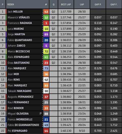 Terzo tempo per l’iridato Bagnaia, che chiude a un decimo e mezzo dall’ex compagno e si tiene dietro Marini e Martin, che completano la Top5. Sesto tempo e tre decimi di ritardo per Quartararo davanti a Zarco e Bezzecchi, mentre Morbidelli con l’unica altra Yamaha è ventesimo. Ottavo Aleix, che al momento della caduta del fratello era in testa, mentre Bastianini è decimo nonché ultimo pilota ammesso direttamente alla Q2 di domani mattina. Il primo degli esclusi è Alex Marquez, 11° a oltre un decimo da Enea e seguito dal quartetto Honda capitanato da Mir.