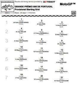 La seconda fila domani verrà aperta da Jack Miller, autore del quarto miglior tempo registrato a due decimi dalla vetta. Nella stessa fila dell’australiano troveranno spazio due redivivi: Franco Morbidelli, quinto, e Marc Marquez, sesto a due decimi e mezzo dal Diablo. Il #93 è arrivato in Q2 grazie al miglior tempo nella preliminare Q1, un 1’39”253 firmato in scia a Mir. Troveranno posto in terza fila Aleix Espargaro su Aprilia, la sorpresa Luca Marini e il Campione MotoGP in carica Joan Mir, promosso in Q2 grazie al secondo miglior tempo nella prequalifica a 49 millesimi da Marc Marquez. Decimo tempo per il padrone di casa, e mattatore della passata edizione, Miguel Oliveira. Sprofonda in 11/a posizione lo sfortunato Pecco Bagnaia, mentre è solo 12° Maverick Vinales, la cui qualificha è stata caratterizzata da innumerevoli giri cancellati, tra cui uno in 1’38”, per aver ecceduto i limiti della pista.