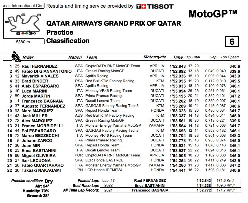 Sesto tempo per Luca Marini, davanti a Martin e Bagnaia che sono vicinissimi: i due che si contendono il titolo piloti MotoGP sono separati da soli 7 millesimi. Nono tempo per Augusto Fernandez, mentre Marc Marquez completa la Top10 regalando una gioia a a Honda.