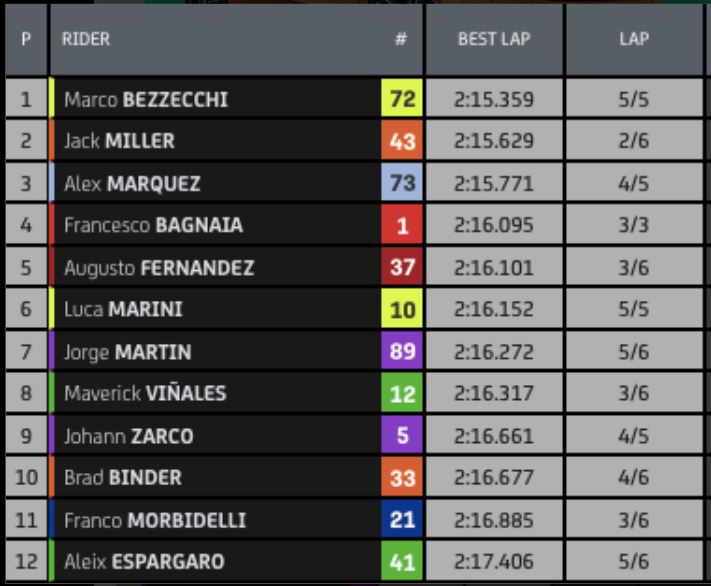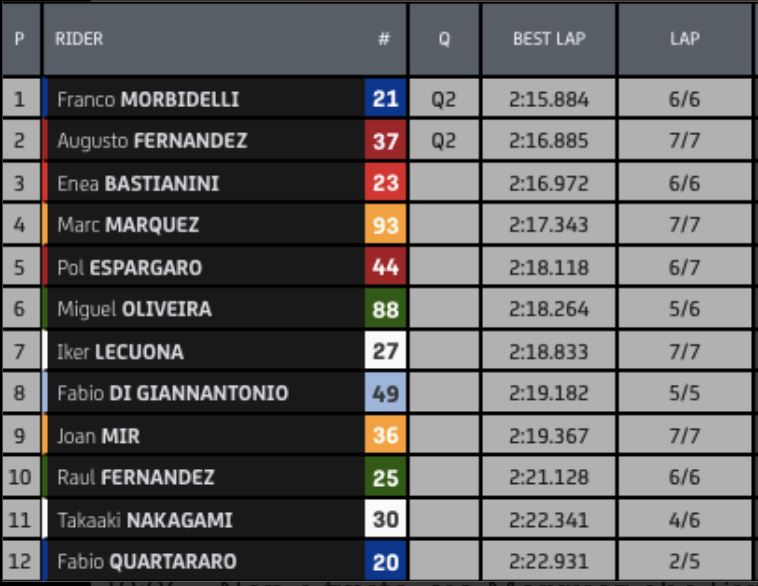Qualifica pazzesca invece per il rookie della MotoGP Augusto Fernandez che, passato per la Q1 dove ha chiuso 2°, completa la Q2 con un ottimo quinto tempo che lo porta in seconda fila e senza cadute. Sesto tempo per Marini, a cui è toccata la stessa sorte di A. Marquez e Bagnaia.