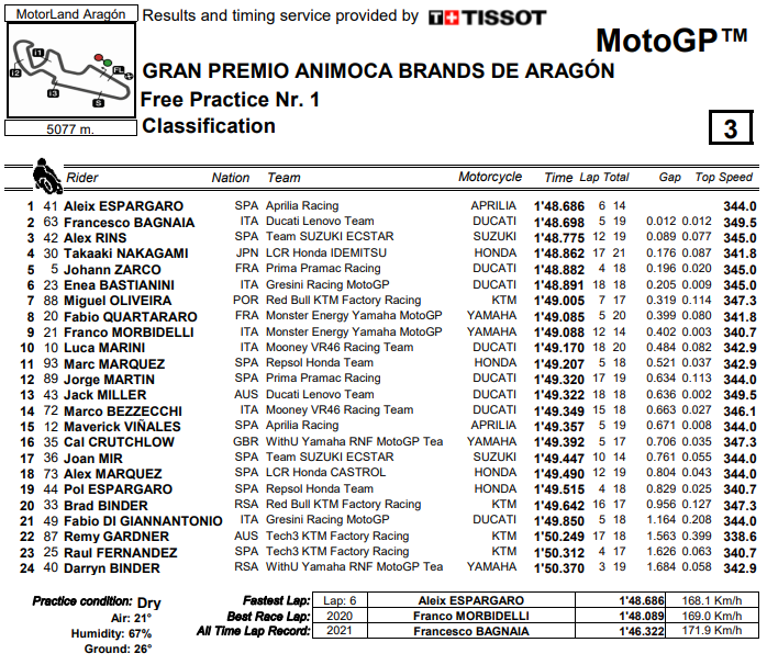 Aleix Espargaro inizia nel migliore dei modi il fine settimana aragonese, su il miglior tempo nelle prime libere davanti a Bagnaia e Rins. Bene Marc Marquez, che manca per un soffio la Top10.