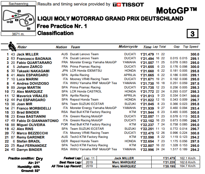 Si tingono di rosso Ducati le prime libere MotoGP del GP di Germania, al Sachsenring è Jack Miller a chiudere davanti a tutti stampando un ottimo 1’21”479 a due decimi e mezzo dal record ufficiale della pista sassone. Grazie al secondo tempo di Bagnaia (+0”015) si tratta di una doppietta per il team Ducati Lenovo che sicuramente non si attendeva un inizio così. Segue Quartararo su Yamaha, il leader iridato ha firmato il terzo miglior tempo pagando solo 78 millesimi all’australiano.