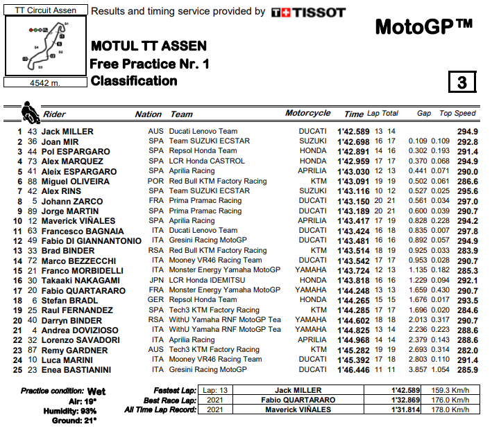 La pioggia, caduta per tutta la prima sessione di libere del GP d’Olanda, ha condizionato il lavoro delle squadre ma permesso ancora una volta a Jack Miller di mettere in mostra tutta la sua abilità sull’asfalto viscido. Jack, che proprio ad Assen ha ottenuto la sua prima vittoria in MotoGP nel 2016, ha marcato un buon 1’42”589 come miglior giro dopo essere stato davanti a tutti per tutta la sessione. Secondo tempo per Joan Mir che nel finale, quando la pioggia è diminuita permettendo ai piloti di girare due secondi più veloci, si è portato a un decimo dall’australiano.