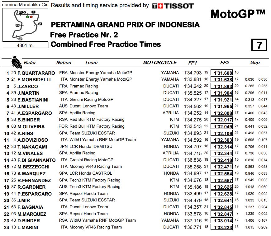 Dopo una sessione mattutina segnata da pioggia e asfalto viscido nelle fasi iniziali, i riferimenti ed i tempi sono emersi solamente nelle pomeridiane FP2. Rispetto ai test, sono cambiati l’asfalto e le gomme così le squadre hanno dovuto rivedere gli assetti studiati in febbraio. Il nuovo asfalto di Mandalika ha sicuramente offerto un grip superiore rispetto a quello di Losail, questo può spiegare l’ottimo ritmo mostrato da Quartararo e Morbidelli in sella alle M1 Factory del team ufficiale. Dopo una sessione passata ad un ottimo ritmo, mantenendo il 32″alto di passo, Quartararo ha concluso le seconde libere firmando il miglior tempo (1’31”608) nel time attack. Secondo tempo per Morbidelli, che paga al compagno di squadra 30 centesimi.