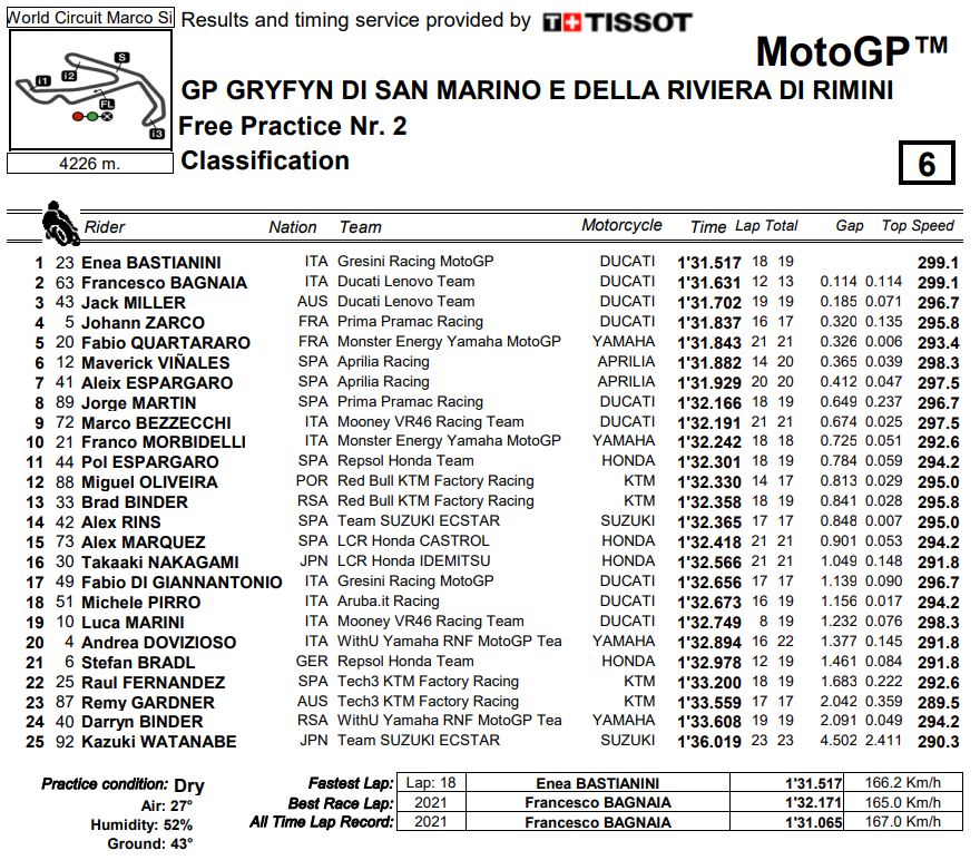 Ancora gita di coppi aper i piloti di Aprilia Racing, che chiudono a ridosso della Top5. Questa volta è Vinales ad avere la meglio, per mezzo decimo, su Espargaro. Seguono Martin e Bezzecchi, entrambi a sei decimi e mezzo dalla vetta.