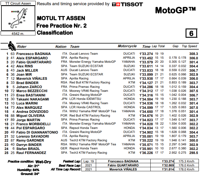 Dopo una prima sessione piovosa, i piloti della MotoGP hanno trovato condizioni in miglioramento nel corso del secondo turno di libere del GP d’Olanda. L’asfalto del TT Circuit di Assen si è presentato ancora bagnato all’inizio della sessione, obbligando l’utilizzo di pneumatici rain, ma l’assenza di pioggia ha fatto sì che giro dopo giro la traiettoria ideale sia andata asciugandosi. Negli ultimi quindici minuti tutti i piloti sono scesi in pista con le slick, seguendo l’esempio di Luca Marini che per primo ha percepito il moneto ideale per il cambio.