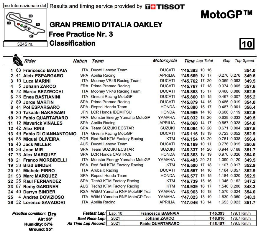Terminano nel segno di Bagnaia le terze libere MotoGP del GP d’Italia, il 63 si porta a un soffio dal record al termine di un turno molto frizzante. Secondo tempo per Aleix Espargaro, che si tiene dietro 5 ducatisti. Male Marquez, 21°.