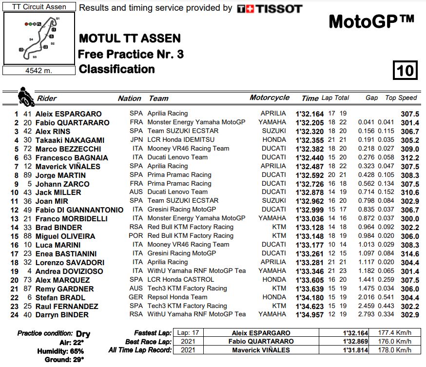 Bel tempo ad Assen, finalmente. I piloti della MotoGP hanno trovato sole ed asfalto asciutto nelle terze libere del GP d’Olanda. Una sessione in cui a brillare è stata Aprilia grazie all’ottimo ritmo sia di Espargaro che di Vinales. Alla fine è proprio di Aleix il miglior tempo, un 1’32”164, nonostante una caduta a cinque minuti dal termine che lo ha costretto a chiudere la sessione in anticipo. Quartararo non è riuscito superare lo spagnolo di Noale, terminando secondo a quattro centesimi dopo essere arrivato a soli due millesimi con un tempo poi cancellato.