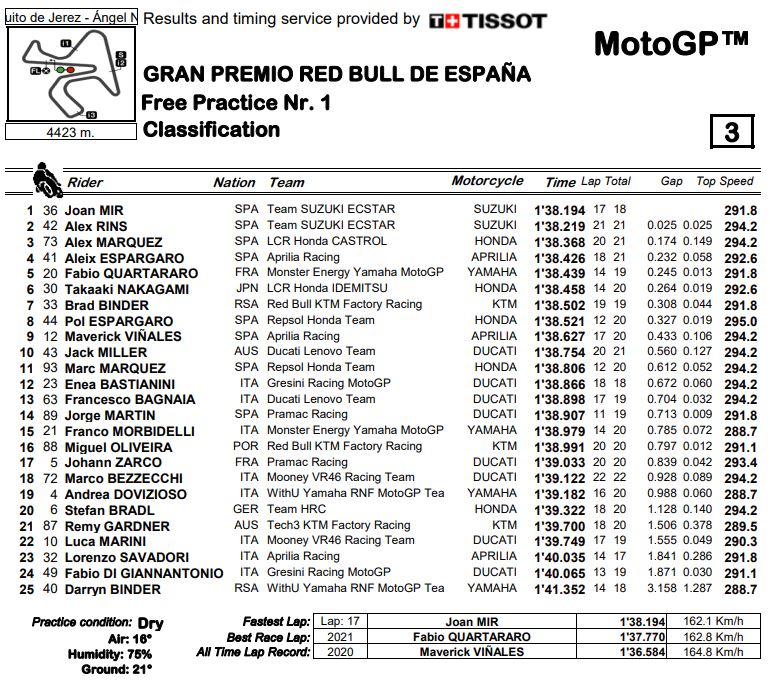 Con 25 millesimi di margine sul campagno è Mir il più veloce al termine delle prime libere MotoGP in Spagna. Prime libere positive per i piloti Honda, al contrario per il piloti Ducati.