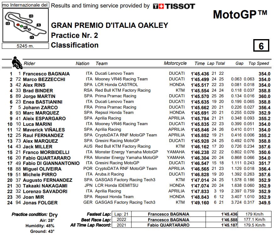 Terzo tempo un po’ a sorpresa per Rins su Honda LCR capace nel finale di mettere finalmente assieme un giro buono, anzi buonissimo visti i soli 81 millesimi a separarlo da Bagnaia, dopo una serie di incomprensioni con Di Giannatonio (17°) del team Gresini. Oltre ad Alex, c’è anche marc Marquez su Honda in Top10 grazie all’ottavo tempo ottenuto sfruttando al massimo la scia di Maverick Vinales.